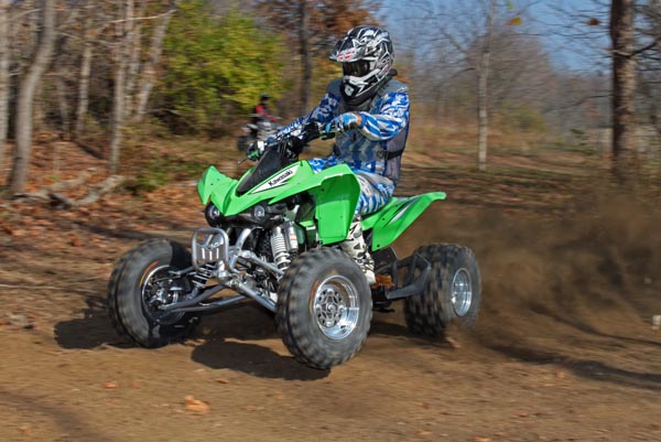 Having tested the KFX on a smooth, flat motocross track with tons of turns, and on sandy wooded trails, we decided to try the 450 out on some faster rougher terrain for 2011. Our first stop was Horseshoe Bend MX in Walton, KY. We then went to a private, wooded motocross track located farther north. Both tracks offered jumps of various sizes, lots of altitude changes, and Horseshoe provided plenty of nasty braking and acceleration bumps.