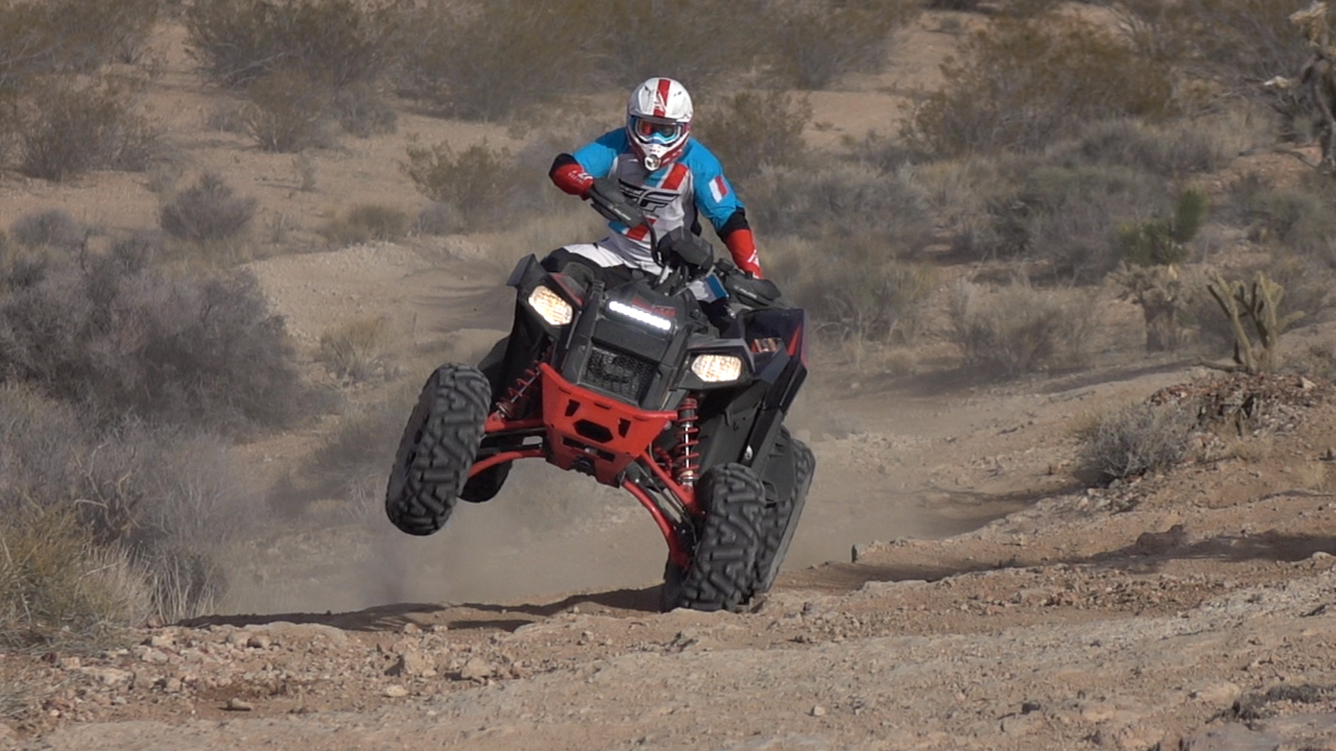 Suspension performance was pretty amazing right out of the box. Over small to medium sized hits, it’s acceptably plush for its sporty intentions. The S lets you pound and skip your way through deep desert whoops in such a way that was formerly reserved for lightweight two-wheel-drive sport ATVs. If you manage to get a little crossed up, you recover with greater ease than you expect from such a behemoth. Land in the face or clip the rear tires doubling through whoops are not a problem with this much travel. Later in the day, we found a rather sizeable mound, perfect for getting some serious air. Ed was flat landing from around 5 to 6 feet of air repeatedly. While he bottomed out a bit on his first few attempts, adding some high-speed compression damping was all that was needed for the Scrambler S to soak up hits that would have been brutal to both man and machine on any other 4×4 ATV.