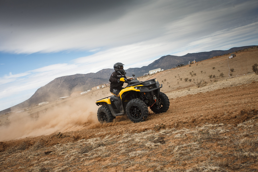 We quickly forgot about the machine’s tall seat height.. The width, sway bar, and shock settings add up to an ATV that corners nice and flat with little diving and body roll entering turns. If the back end started coming around in 2wd, the long wheelbase kept it from feeling abrupt or unexpected.. At high speeds, the Outlander never felt nervous or twitchy on the flat high-speed straights we tested on.