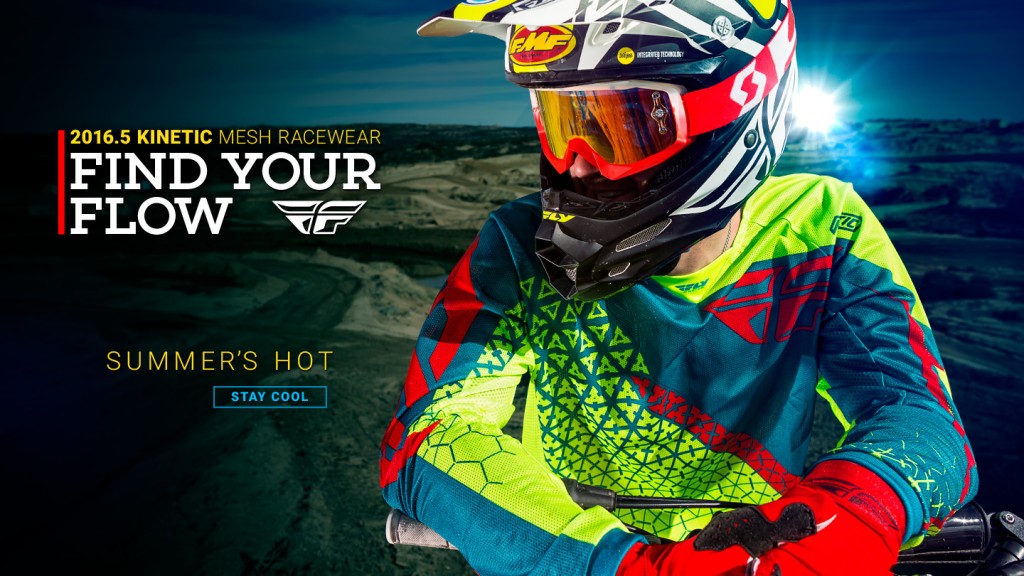FLY Racing has released its 2016.5 Kinetic Mesh Racewear in preparation for the coming summer race season. This fully ventilated mesh jersey and pant combo is designed to help you make the most of the great outdoors during the long hot days of summer, yet is still as durable as our standard Kinetic racewear. Look for FLY Racing pro riders as they debut the racewear during Daytona Bike Week at the Daytona Supercross, GNCC round one in Palatka, the Daytona ATV SX and more. Beat the heat and find your flow with FLY Racing’s Kinetic Mesh racewear. Available at FLY Racing dealers nationwide.