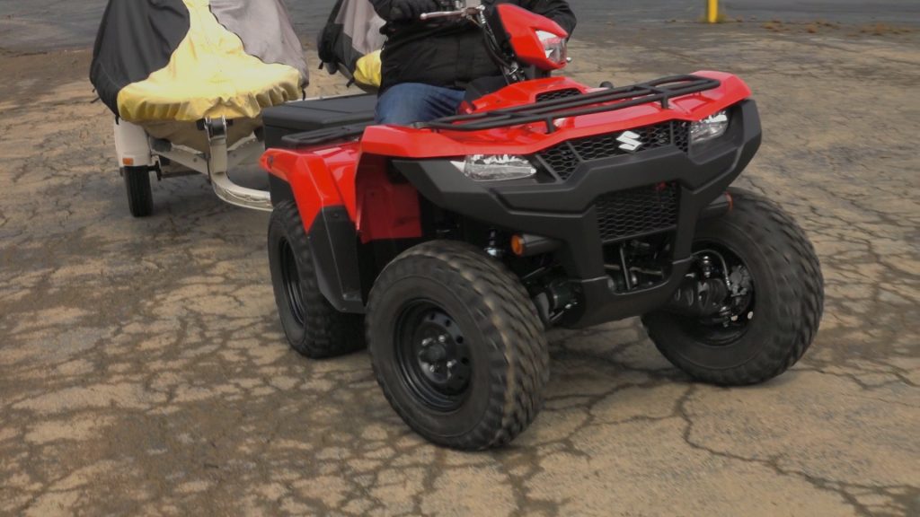 We loaded down our KingQuad with a couple of personal watercraft without balancing the ride by stiffening up the rear shocks. Much to our surprise, the front end still steered predictably on blacktop, even in two-wheel drive. We noticed a small amount of front-end push on gravel, until we engaged limited-slip four-wheel-drive, after which, the Mongrels pulled the quad through corners with precision.