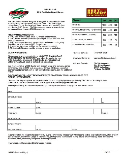 Anaheim, Calif. – January 5, 2016 – GBC Motorsports will be offering their GBC Bucks contingency program for the 2016 Best in the Desert Series. The GBC Bucks Awards Program rewards ATV & UTV racers that achieve success while using GBC tires. This season there will be more than $80,000 in GBC Bucks up for grabs across UTV and ATV classes.