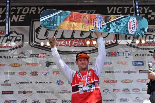 Chris Borich holds up his overall trophy after earning his first win of the 2018 season.