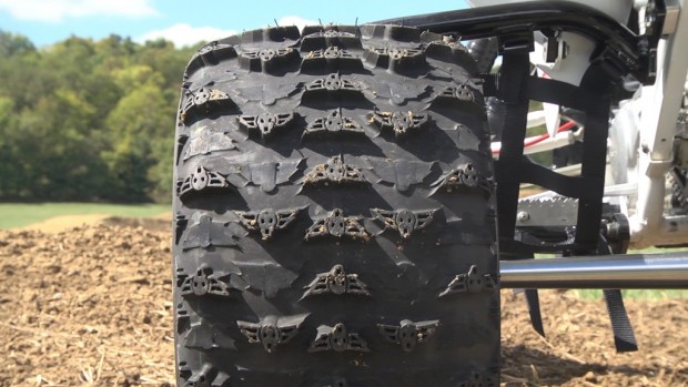 After a quick rear wheel swap, it was time to run the grooved tires. When Dave dumped the clutch, the tires spun until he upshifted. The tires then hooked up and drove hard through the tilled soil. The grooved Bomb Squads clearly outperformed the stock tires on the start.The most challenging corners for the stock GBC’s could be attacked with more throttle and body English, enhancing corner exit speeds, and making the following jumps easier to clear.