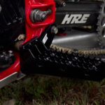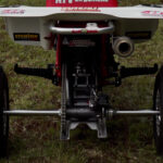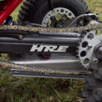 To improve high-speed stability, make the back end easier to break loose  aand maximize front-end grip, we installed a +2” swingarm from HRE. The added length also slightly increases rear suspension travel. The robust looking swingarm is made of 4130 chromoly. We ordered ours to work with the stock 200X brakes and axle carrier with a black/silver vain powdercoat finish.  Although HRE offers swingarms with round-housing chain adjustability, compatible with TRX450R brakes.