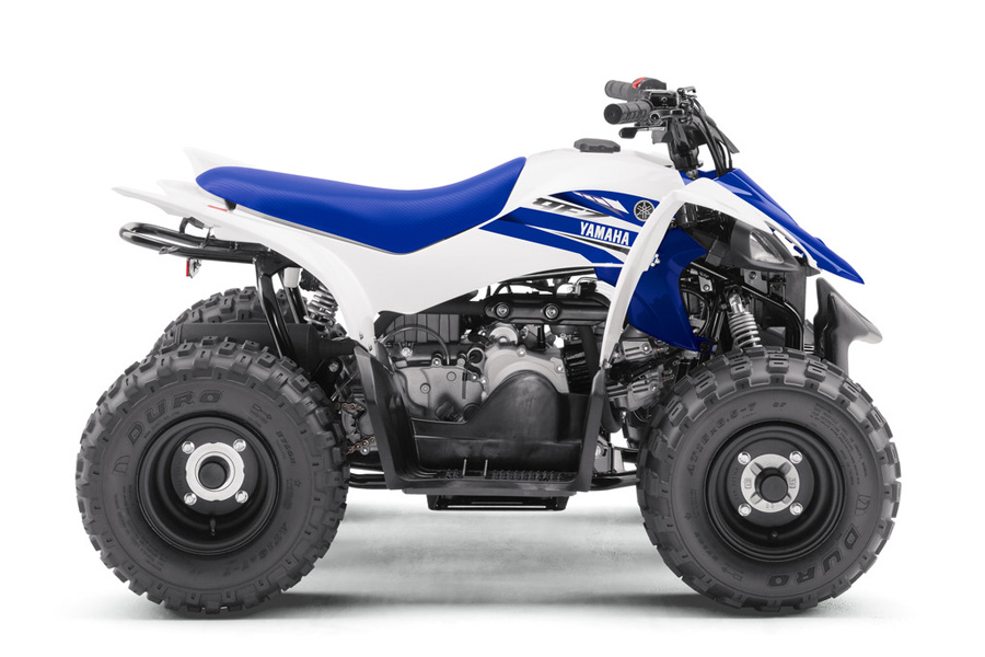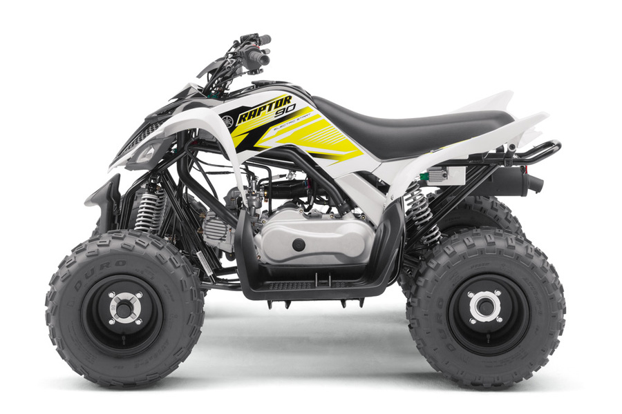 For riders ages 10-years-old and up, the Raptor 90 serves up styling and a sporty ride reminiscent of its big brother, the Raptor 700, but at a size and performance level appropriate for younger riders and budding enthusiasts. New for 2017, the Raptor 90 is now available in White, along with the Team Yamaha Blue / White. The Raptor 90 mounts an 89.9cc air-cooled engine with a CVT transmission on a newly designed lightweight chassis, providing seamless acceleration with no need for shifting. Reverse gives young riders more versatility on the trail. The Raptor 90 provides sporty performance while maintaining a comfortable ride and simple operation. Additional features that help provide increased performance and comfort include new front and rear suspension, 18-inch tires with lightweight matte black wheels, a plush seat and wider floorboards. The Raptor 90 MSRP is $2,899.